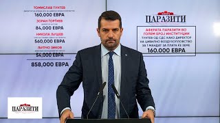 Дел од аферата Паразити е Томислав Тунтев, директор на Агенцијата за Цивилно воздухопловство, кој зема плата од 203.000 денари месечно. Односно 3.300 евра месечно. Тоа се 40.000 евра за една година. Додека народот има просечна плата од 470 евра, за Тунтев од СДС тоа се 3300 евра.